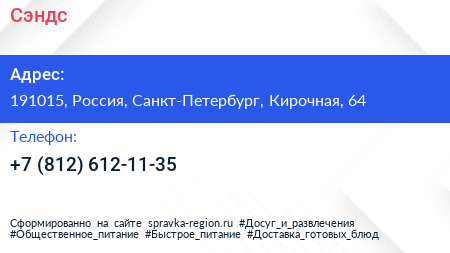 Сэндс по адресу 191015, Россия, Санкт-Петербург, Кирочная, 64 в дальнейшем Организация, размещена в следующих категориях: