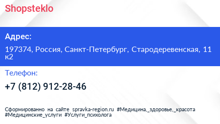 Shopsteklo по адресу 197374, Россия, Санкт-Петербург, Стародеревенская, 11 к2 в дальнейшем Организация, размещена в следующих категориях: