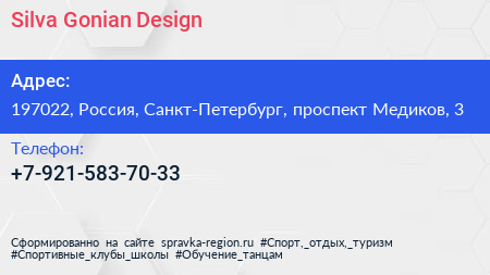 Silva Gonian Design по адресу 197022, Россия, Санкт-Петербург, проспект Медиков, 3 в дальнейшем Организация, размещена в следующих категориях: