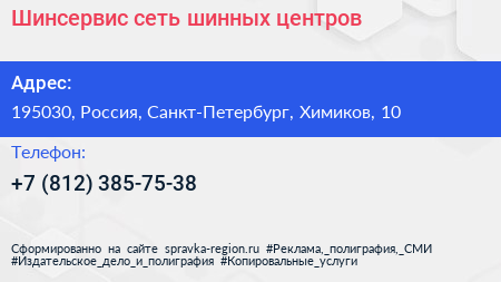 Шинсервис, сеть шинных центров по адресу 195030, Россия, Санкт-Петербург, Химиков, 10 в дальнейшем Организация, размещена в следующих категориях: