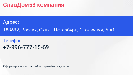 СлавДом53, компания по адресу 188692, Россия, Санкт-Петербург, Столичная, 5 к1 в дальнейшем Организация, размещена в следующих категориях: