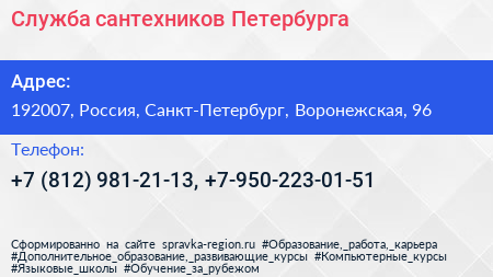 Служба сантехников Петербурга по адресу 192007, Россия, Санкт-Петербург, Воронежская, 96 в дальнейшем Организация, размещена в следующих категориях: