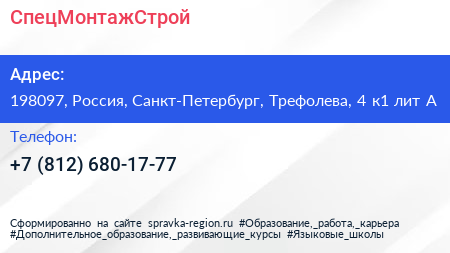 СпецМонтажСтрой по адресу 198097, Россия, Санкт-Петербург, Трефолева, 4 к1 лит А в дальнейшем Организация, размещена в следующих категориях: