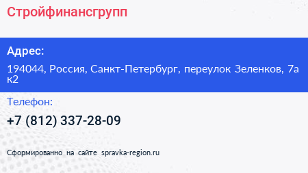 Стройфинансгрупп по адресу 194044, Россия, Санкт-Петербург, переулок Зеленков, 7а к2 в дальнейшем Организация, размещена в следующих категориях: