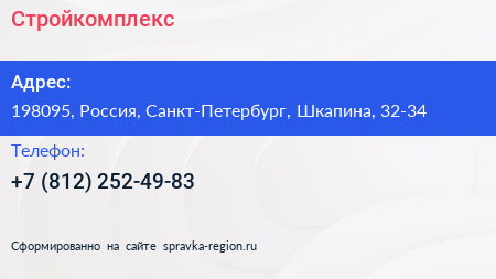 Стройкомплекс по адресу 198095, Россия, Санкт-Петербург, Шкапина, 32-34 в дальнейшем Организация, размещена в следующих категориях: