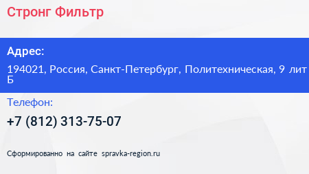 Стронг-Фильтр по адресу 194021, Россия, Санкт-Петербург, Политехническая, 9 лит Б в дальнейшем Организация, размещена в следующих категориях: