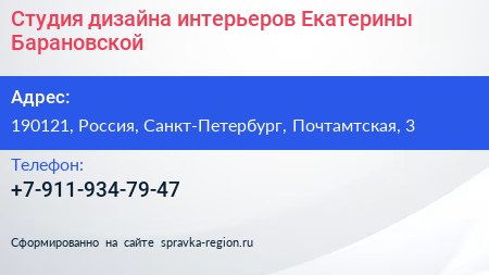 Студия дизайна интерьеров Екатерины Барановской по адресу 190121, Россия, Санкт-Петербург, Почтамтская, 3 в дальнейшем Организация, размещена в следующих категориях: