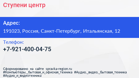 Ступени, центр по адресу 191023, Россия, Санкт-Петербург, Итальянская, 12 в дальнейшем Организация, размещена в следующих категориях: