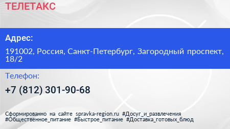 ТЕЛЕТАКС по адресу 191002, Россия, Санкт-Петербург, Загородный проспект, 18/2 в дальнейшем Организация, размещена в следующих категориях: