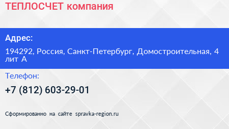 ТЕПЛОСЧЕТ, компания по адресу 194292, Россия, Санкт-Петербург, Домостроительная, 4 лит А в дальнейшем Организация, размещена в следующих категориях: