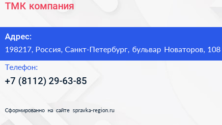 ТМК, компания по адресу 198217, Россия, Санкт-Петербург, бульвар Новаторов, 108 в дальнейшем Организация, размещена в следующих категориях:
