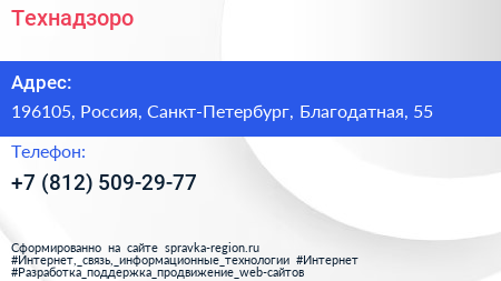Технадзоро по адресу 196105, Россия, Санкт-Петербург, Благодатная, 55 в дальнейшем Организация, размещена в следующих категориях: