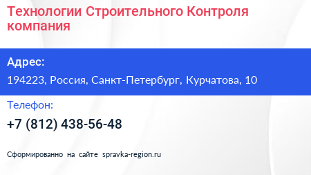 Технологии Строительного Контроля, компания по адресу 194223, Россия, Санкт-Петербург, Курчатова, 10 в дальнейшем Организация, размещена в следующих категориях: