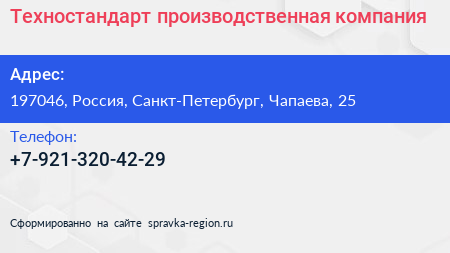 Техностандарт, производственная компания по адресу 197046, Россия, Санкт-Петербург, Чапаева, 25 в дальнейшем Организация, размещена в следующих категориях: