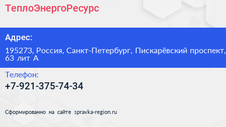ТеплоЭнергоРесурс по адресу 195273, Россия, Санкт-Петербург, Пискарёвский проспект, 63 лит А в дальнейшем Организация, размещена в следующих категориях:
