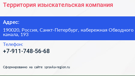 Территория, изыскательская компания по адресу 190020, Россия, Санкт-Петербург, набережная Обводного канала, 193 в дальнейшем Организация, размещена в следующих категориях: