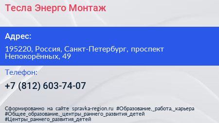 Тесла Энерго Монтаж по адресу 195220, Россия, Санкт-Петербург, проспект Непокорённых, 49 в дальнейшем Организация, размещена в следующих категориях: