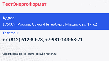 ТестЭнергоФормат по адресу 195009, Россия, Санкт-Петербург, Михайлова, 17 к2 в дальнейшем Организация, размещена в следующих категориях: