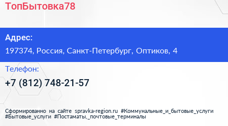 ТопБытовка78 по адресу 197374, Россия, Санкт-Петербург, Оптиков, 4 в дальнейшем Организация, размещена в следующих категориях: