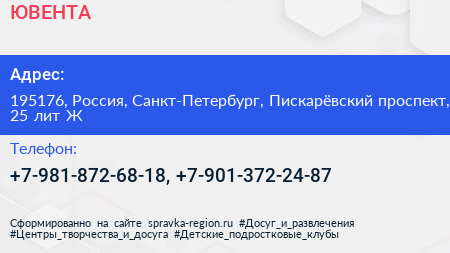 ЮВЕНТА+ по адресу 195176, Россия, Санкт-Петербург, Пискарёвский проспект, 25 лит Ж в дальнейшем Организация, размещена в следующих категориях: