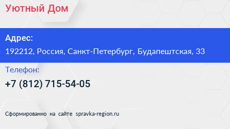 Уютный Дом по адресу 192212, Россия, Санкт-Петербург, Будапештская, 33 в дальнейшем Организация, размещена в следующих категориях: