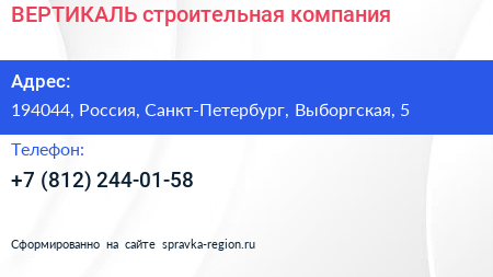 ВЕРТИКАЛЬ, строительная компания по адресу 194044, Россия, Санкт-Петербург, Выборгская, 5 в дальнейшем Организация, размещена в следующих категориях:
