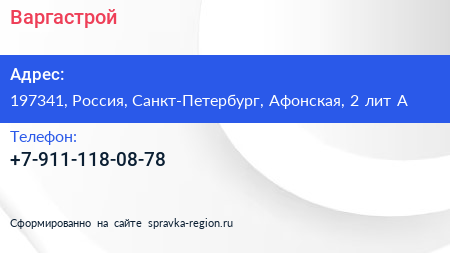 Варгастрой по адресу 197341, Россия, Санкт-Петербург, Афонская, 2 лит А в дальнейшем Организация, размещена в следующих категориях: