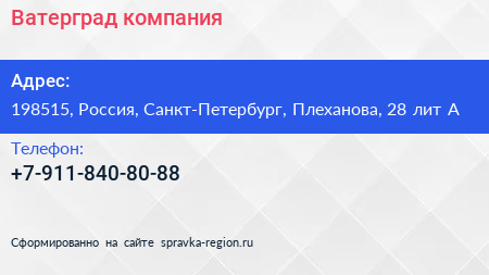 Ватерград, компания по адресу 198515, Россия, Санкт-Петербург, Плеханова, 28 лит А в дальнейшем Организация, размещена в следующих категориях: