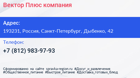 Вектор Плюс, компания по адресу 193231, Россия, Санкт-Петербург, Дыбенко, 42 в дальнейшем Организация, размещена в следующих категориях: