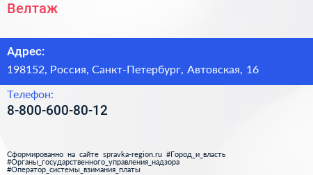 Велтаж по адресу 198152, Россия, Санкт-Петербург, Автовская, 16 в дальнейшем Организация, размещена в следующих категориях: