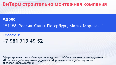 ВиТерм, строительно-монтажная компания по адресу 191186, Россия, Санкт-Петербург, Малая Морская, 11 в дальнейшем Организация, размещена в следующих категориях: