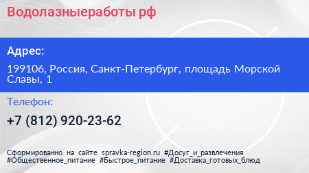 Водолазныеработы.рф по адресу 199106, Россия, Санкт-Петербург, площадь Морской Славы, 1 в дальнейшем Организация, размещена в следующих категориях: