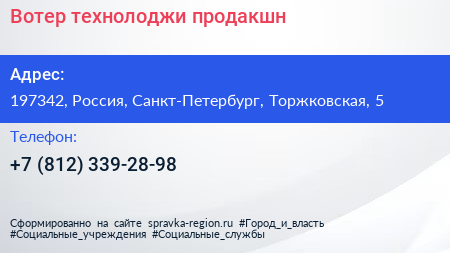 Вотер технолоджи продакшн по адресу 197342, Россия, Санкт-Петербург, Торжковская, 5 в дальнейшем Организация, размещена в следующих категориях: