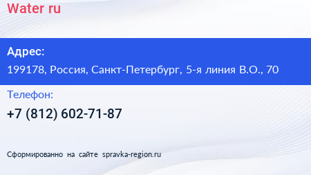Water.ru по адресу 199178, Россия, Санкт-Петербург, 5-я линия В.О., 70 в дальнейшем Организация, размещена в следующих категориях: