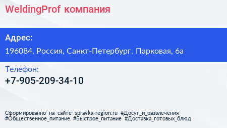 WeldingProf, компания по адресу 196084, Россия, Санкт-Петербург, Парковая, 6а в дальнейшем Организация, размещена в следующих категориях: