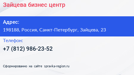 Зайцева, бизнес-центр по адресу 198188, Россия, Санкт-Петербург, Зайцева, 23 в дальнейшем Организация, размещена в следующих категориях: