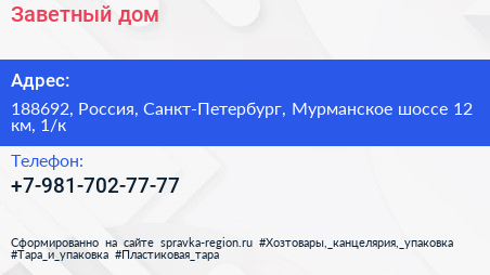 Заветный дом по адресу 188692, Россия, Санкт-Петербург, Мурманское шоссе 12 км, 1/к в дальнейшем Организация, размещена в следующих категориях: