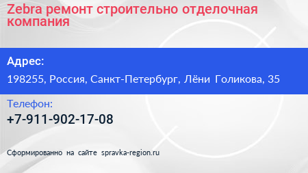 Zebra ремонт, строительно-отделочная компания по адресу 198255, Россия, Санкт-Петербург, Лёни Голикова, 35 в дальнейшем Организация, размещена в следующих категориях: