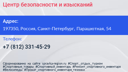 Центр безопасности и изысканий по адресу 197350, Россия, Санкт-Петербург, Парашютная, 54 в дальнейшем Организация, размещена в следующих категориях: