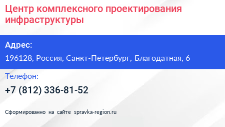 Центр комплексного проектирования инфраструктуры по адресу 196128, Россия, Санкт-Петербург, Благодатная, 6 в дальнейшем Организация, размещена в следующих категориях: