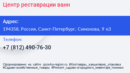 Центр реставрации ванн по адресу 194358, Россия, Санкт-Петербург, Симонова, 9 к3 в дальнейшем Организация, размещена в следующих категориях: