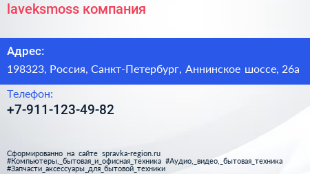 laveksmoss, компания по адресу 198323, Россия, Санкт-Петербург, Аннинское шоссе, 26а в дальнейшем Организация, размещена в следующих категориях: