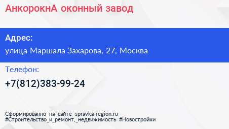 АнкорокнА оконный завод по адресу улица Маршала Захарова, 27, Москва в дальнейшем Организация, размещена в следующих категориях:
