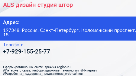 ALS, дизайн-студия штор по адресу 197348, Россия, Санкт-Петербург, Коломяжский проспект, 18 в дальнейшем Организация, размещена в следующих категориях:
