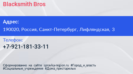 Blacksmith Bros по адресу 190020, Россия, Санкт-Петербург, Лифляндская, 3 в дальнейшем Организация, размещена в следующих категориях:
