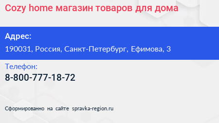 Cozy home, магазин товаров для дома по адресу 190031, Россия, Санкт-Петербург, Ефимова, 3 в дальнейшем Организация, размещена в следующих категориях: