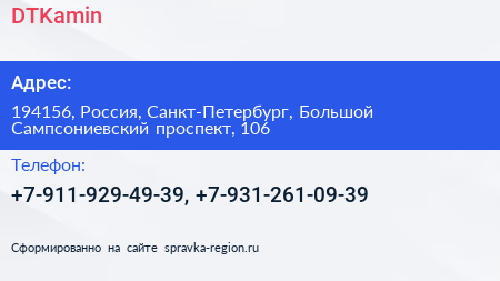 DTKamin по адресу 194156, Россия, Санкт-Петербург, Большой Сампсониевский проспект, 106 в дальнейшем Организация, размещена в следующих категориях: