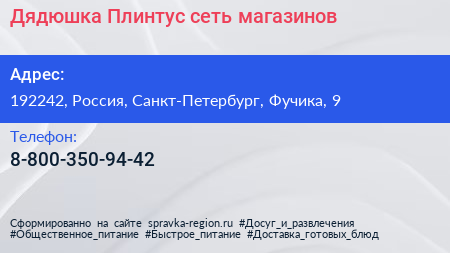 Дядюшка Плинтус, сеть магазинов по адресу 192242, Россия, Санкт-Петербург, Фучика, 9 в дальнейшем Организация, размещена в следующих категориях: