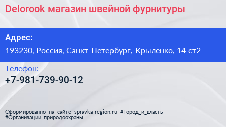 Delorook, магазин швейной фурнитуры по адресу 193230, Россия, Санкт-Петербург, Крыленко, 14 ст2 в дальнейшем Организация, размещена в следующих категориях: