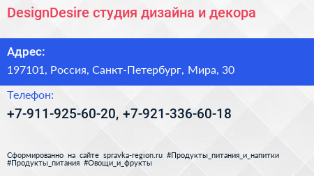 DesignDesire, студия дизайна и декора по адресу 197101, Россия, Санкт-Петербург, Мира, 30 в дальнейшем Организация, размещена в следующих категориях: